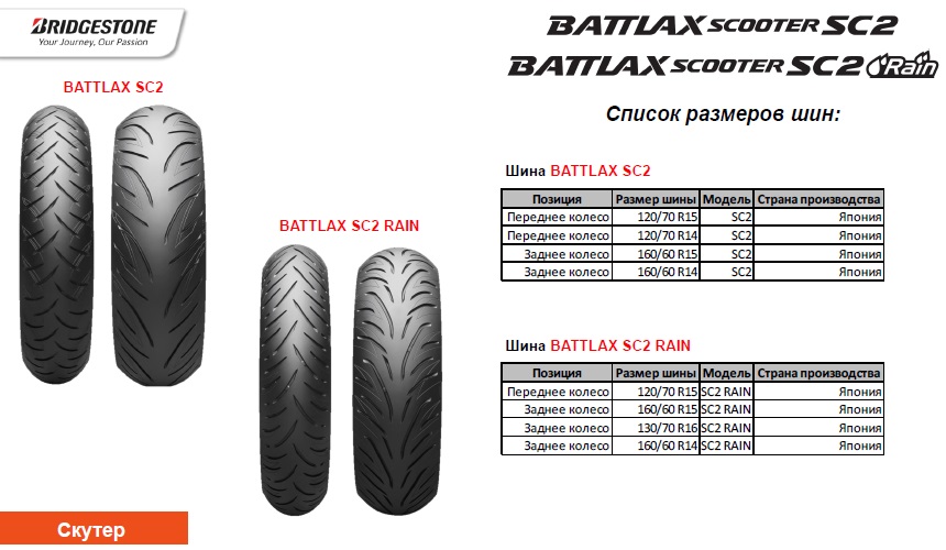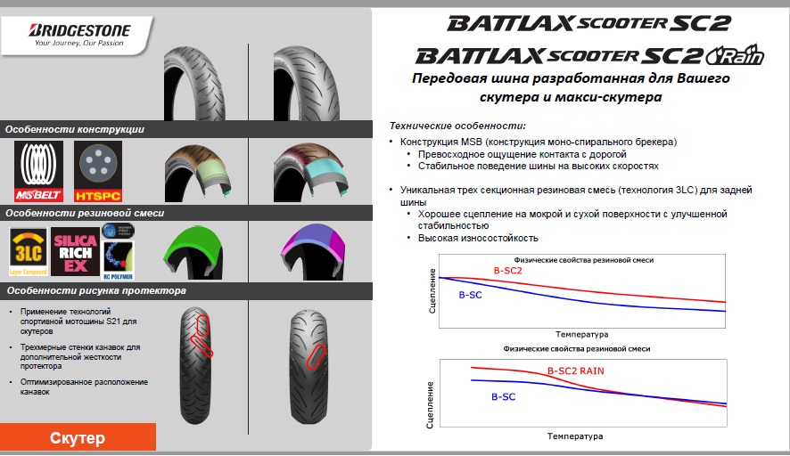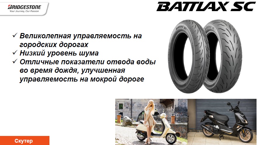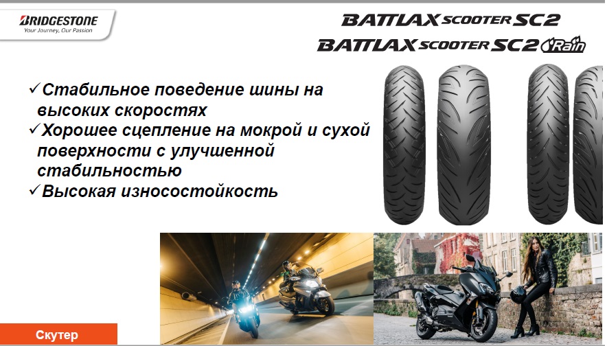 Особый рисунок протектора Bridgestone Battlax sc2 Rain обеспечивают превосходное сцепление и чувство уверенности. Независимо от состояния поверхности, SC2 доставит вас к месту назначения с максимальным уровнем комфорта.
